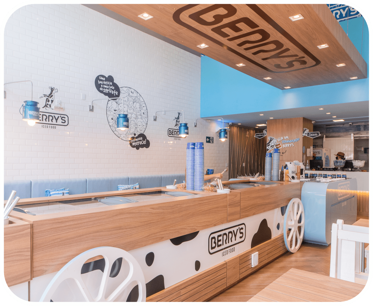 Na Berry's cada detalhe foi pensado para potencializar a experiência do cliente. Cores, texturas, iluminação e trilha sonora remetem ao universo country e ao prazer de se deliciar com um sorvete perfeito.